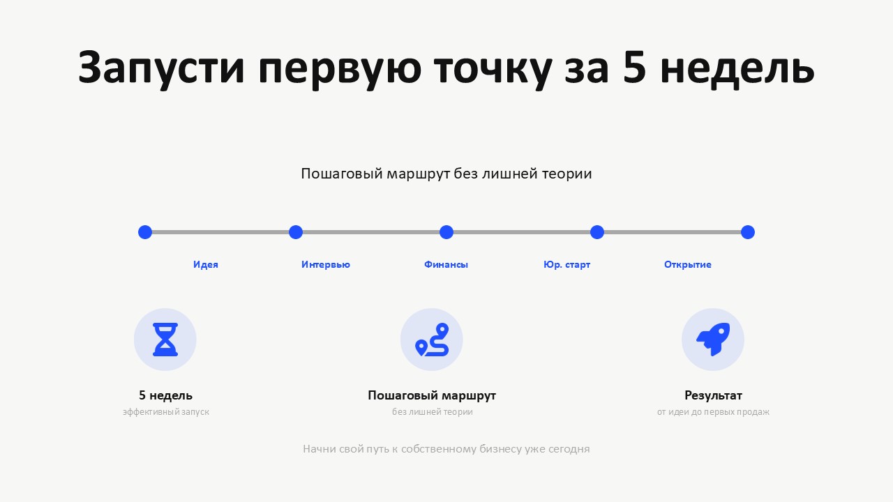 За 5 недель ты соберёшь проект точки по шагам: • проверишь, что идею реально купят • посчитаешь экономику • подготовишь юридическую базу и сделаешь план открытия К финалу у тебя будет не «презентация мечты», а готовый пакет запуска: идея + спрос + финмодель + документы + сценарий старта.