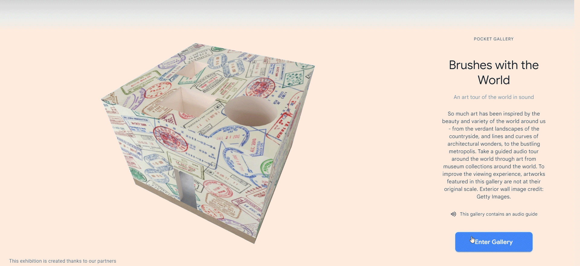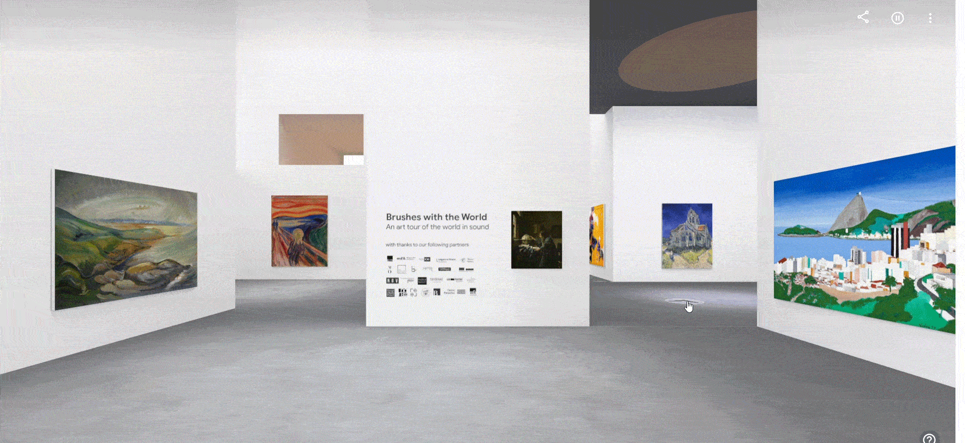 Онлайн-выставка, относящаяся к категории имитации также может выглядеть следующим образом: проект «Brushes with the world» от Pocker Gallery (также размещена на платформе Google Arts& Culture) полностью воспроизводит опыт посещения традиционного музея, например, мы можем свободно перемещаться по виртуальным залам, подходить к картинам и узнавать о них что-то новое. Такой подход демонстрирует стремление сохранить такой привычный музейный ритуал, как неспешное исследование, физическую близость к работам и возможность выбора маршрута.