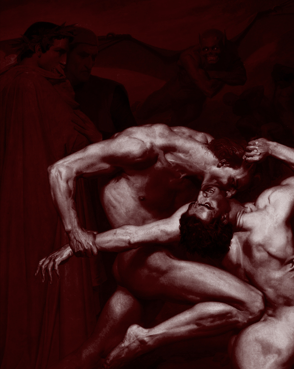 На картине запечатлен эпизод из песни XXX «Ада». В восьмом круге, предназначенном для обманщиков, Данте и Вергилий становятся свидетелями яростной схватки: одержимый Джанни Скикки вгрызается в горло алхимика и еретика Капоккио. Художник выбрал момент наивысшего физического и эмоционального напряжения.