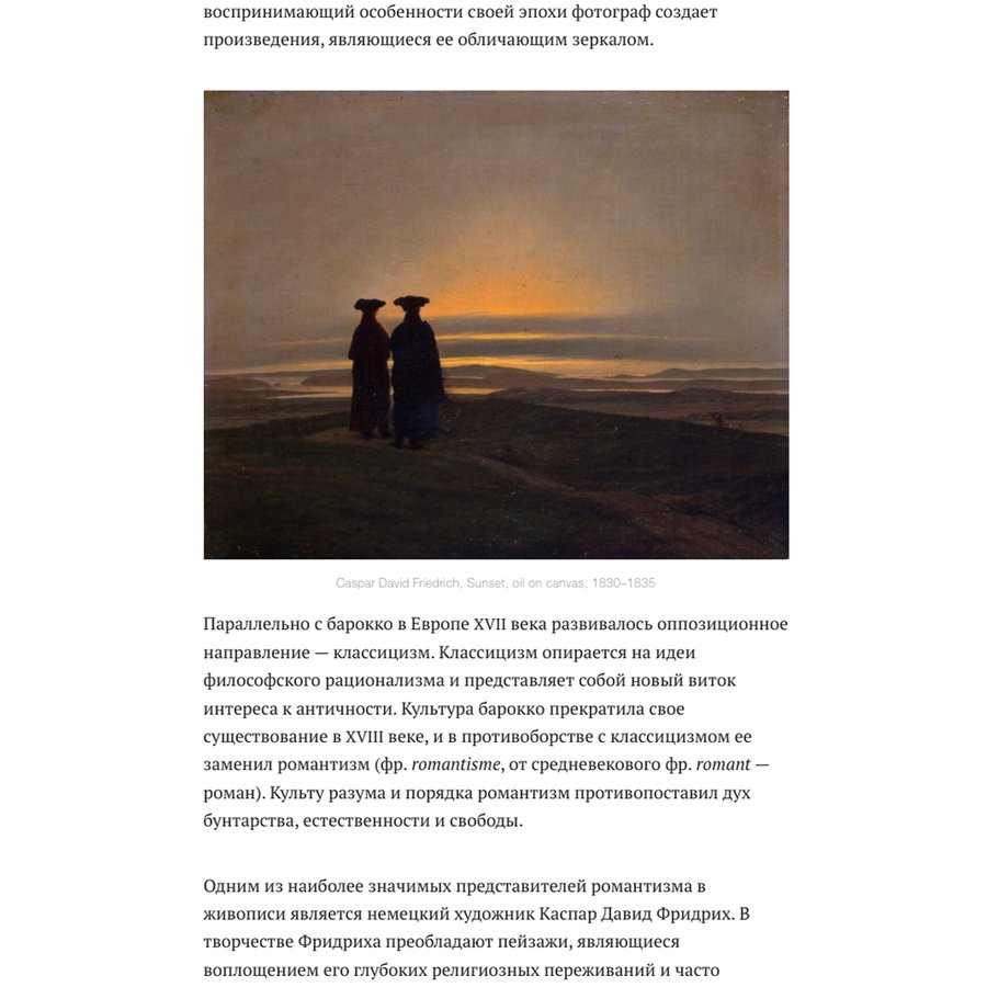 Мой текст «Пикториализм: Перезагрузка. Живописный эффект в современной фотографии» посвящен влиянию живописной традиции на современные фотографические практики. Приведенные примеры из современной фотографии рассматриваются в контексте последовательного развития эпох в истории живописи.
