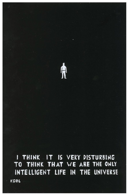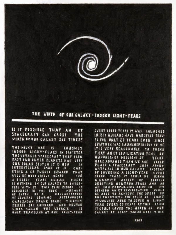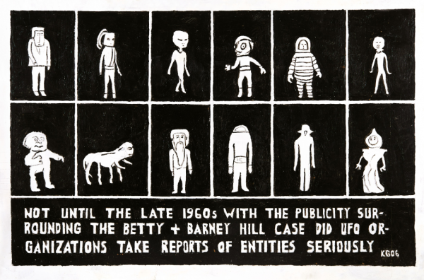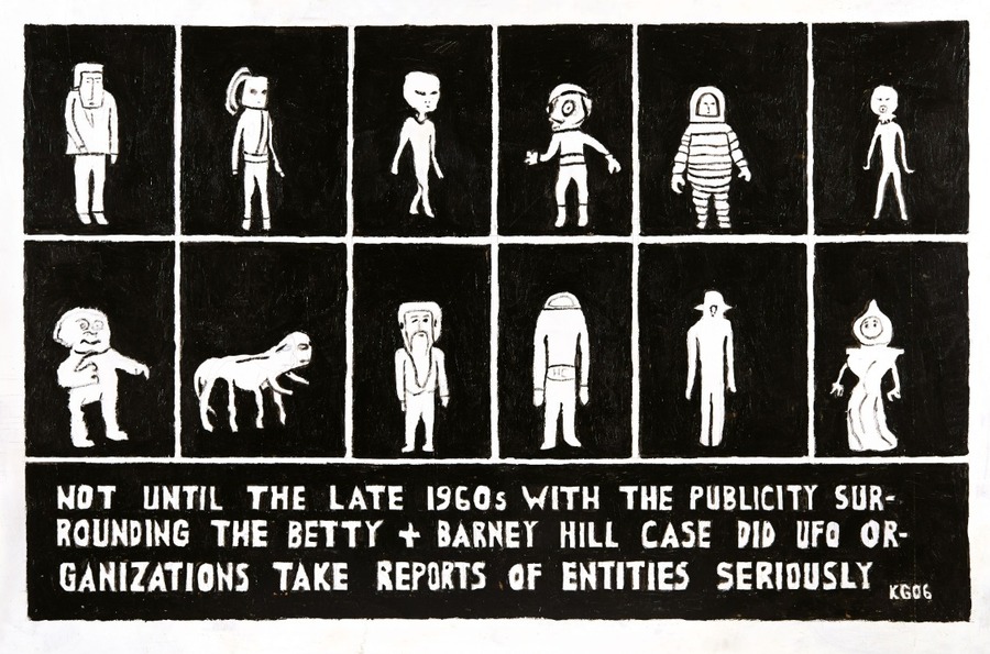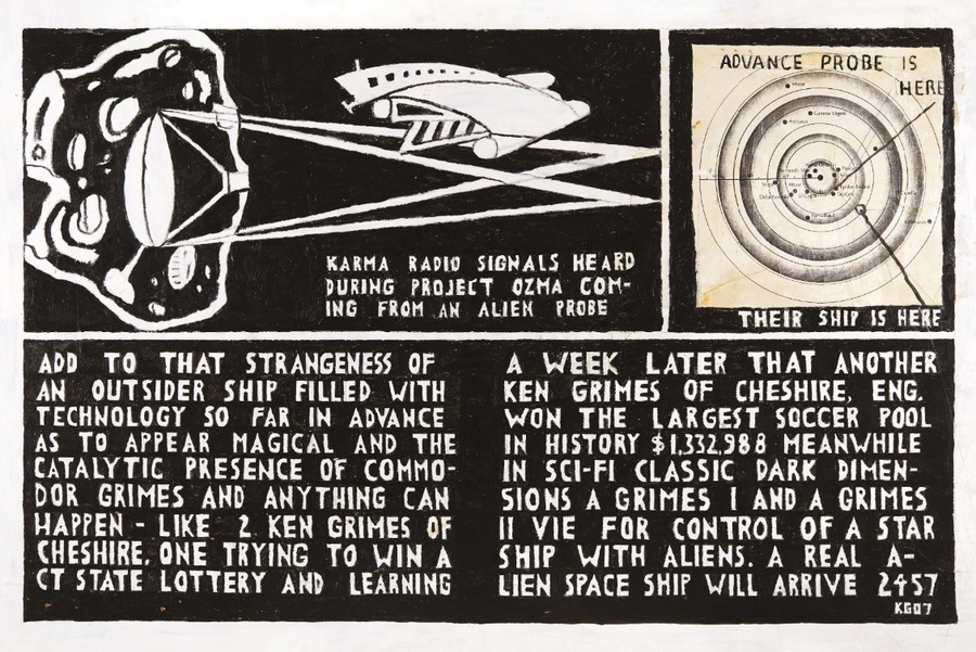 Кен Граймс (род. 1947) на протяжении более сорока лет развивал уникальный стиль, сосредоточенный на темах внеземного контакта и космических совпадений. Его работы известны резкими чёрно-белыми композициями, где текст и изображение работают в тесном диалоге. Граймс внимательно копирует выдержки из своих любимых паранормальных теорий, одновременно добавляя собственные мнения и наблюдения