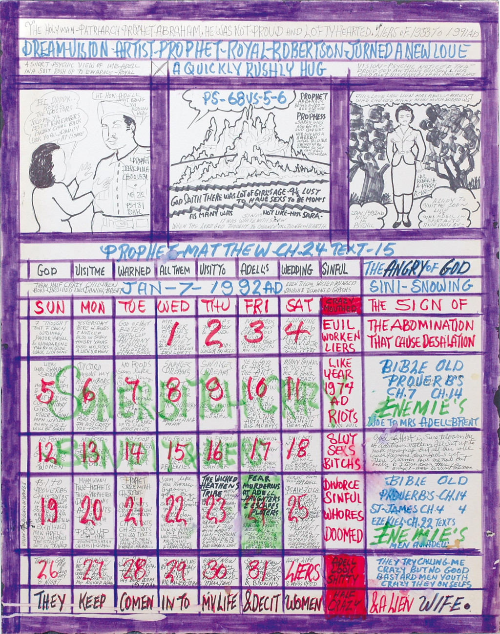 Его творчество можно разделить на две стороны — буквально и фигурально. На одной стороне картины или календаря Робертсон создавал плотные текстовые композиции: библейские цитаты, личные наблюдения, пророчества и гневные выпады. На другой стороне — фантастические существа, космические корабли, драконы и мистические фигуры.