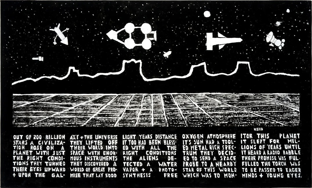 Его композиции часто разделены на две части: одна представляет собой «стену текста», напоминающую интенсивные научные заметки, другая — пиктографическую, с изображениями потрясающих инопланетных концепций. В этом случае текст не просто дополняет изображение, а становится своего рода дневниковой записью, где слово фиксирует момент озарения или гипотезы