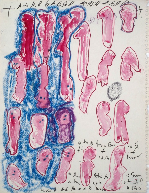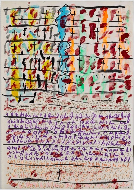 Слои текста нарастают, буквы пересекаются, слова становятся неразборчивыми — текст переходит в абстракцию. Для этого Миллер использует несколько медиумов одновременно: карандаш, ручку, фломастер, краску и даже печатную машинку. Всё это наслаивается в сложную визуальную партитуру
