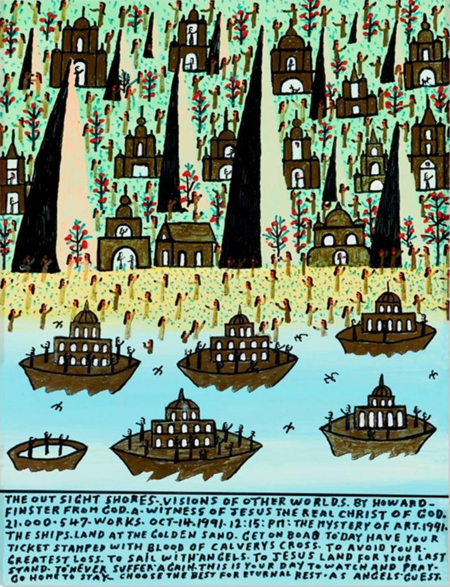 Упомянутый ранее Говард Финстер проповедовал на протяжении сорока лет, но заметил, что его слова люди забывают почти сразу же после проповеди. В попытке запечатлеть свои откровения, Финстер строил Paradise Garden — святое убежище из обломков и мусора, где каждый предмет был памятником Богу. А в 1976 году, когда он красил краской велосипед, на его пальце появилось пятно краски, которое приняло форму лица. Голос сказал ему: «Пиши священное искусство» (Paint sacred art). С этого дня Финстер посвятил себя живописи, создав более 46 991 работу за оставшиеся 25 лет жизни