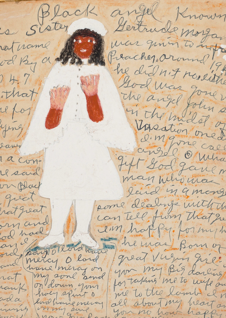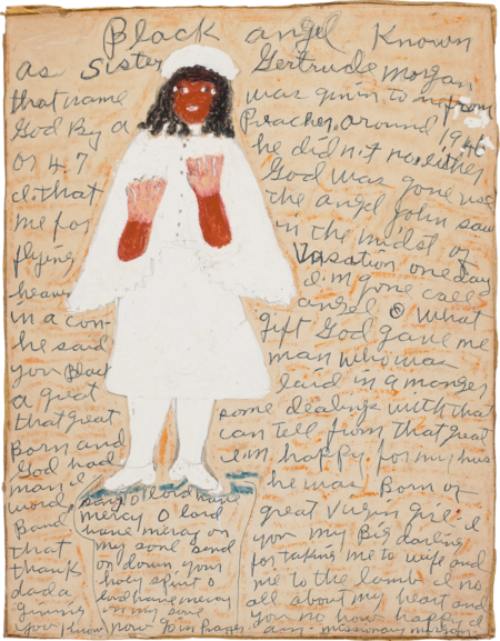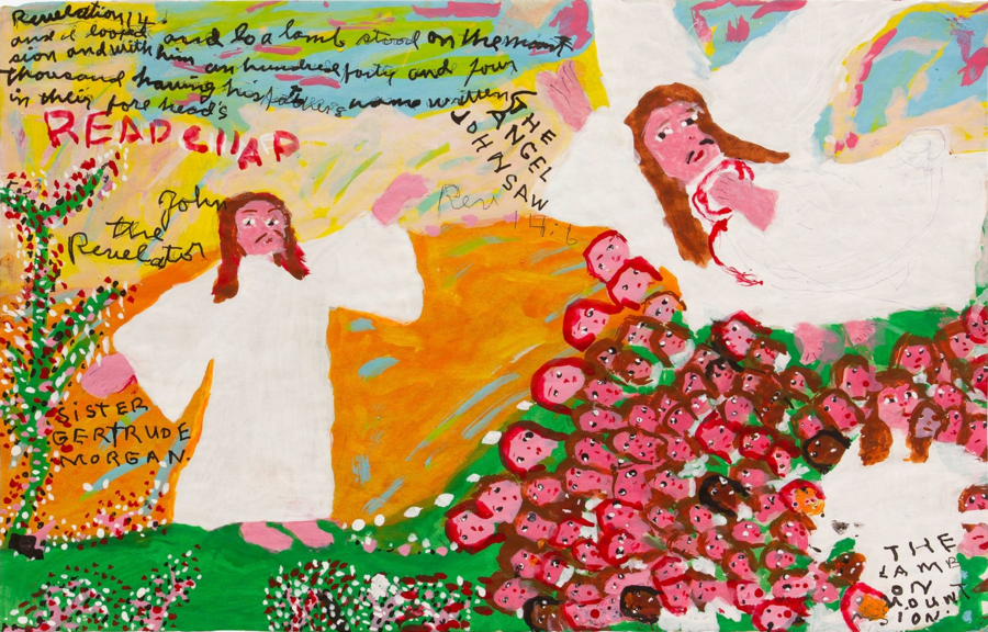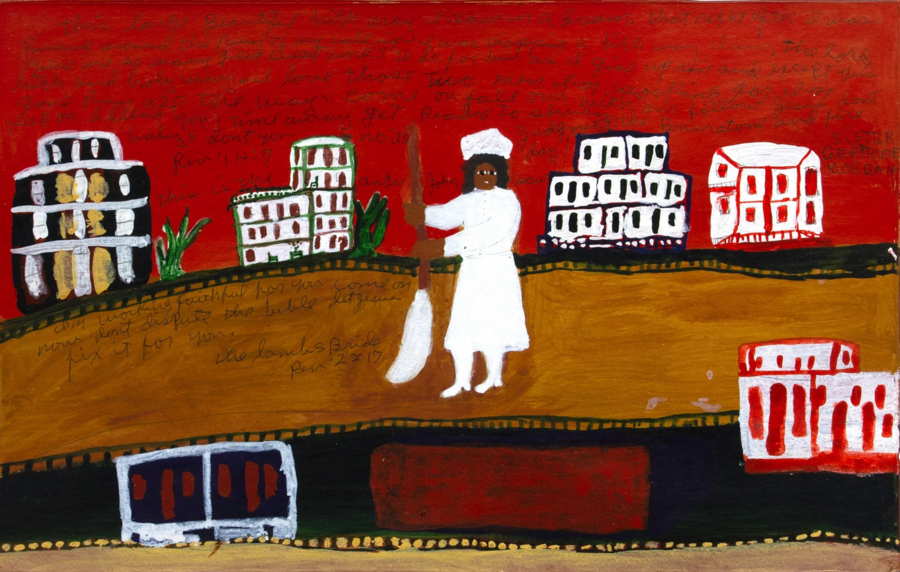 Сестра Гертруда Морган (1900–1980) также пережила божественное откровение — в 1934 голос Бога велел ей: «Иди и проповедуй — расскажи миру!». Она проповедовала и пела, пока в 1956 году, в возрасте 56 лет, не начала рисовать. Морган не считала себя художницей. Но она расписывала всё, что попадалось под руку: двери, коробки от стирального порошка, поддоны из пенопласта, туалетную бумагу, гитарные кейсы, картонные мегафоны. Каждая поверхность становилась холстом для евангельского послания.