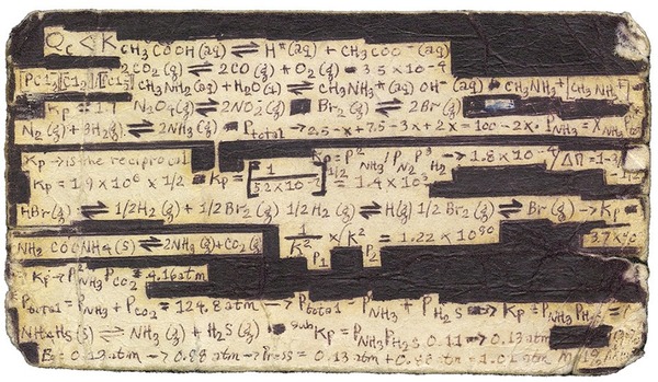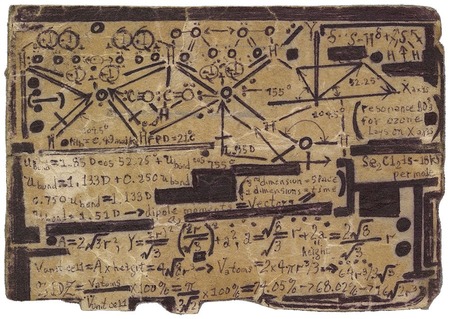 Работы Мелвина Уэя представляют собой гибрид скрипта, математических уравнений, научных формул и алхимических символов на обрывках найденной бумаги.