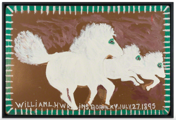 Уильям Лоуренс Хокинс (1895–1990) вырос на ферме, где ухаживал за животными, которых впоследствии регулярно изображал в своих картинах. Серьёзно начал рисовать в 1970-х годах. Он собирал выброшенные краски, старые доски, найденные материалы, используя их для своих работ. Его картины отличаются смелым использованием подписи как декоративного элемента. На полях его картин часто появляется его имя, часто многократно повторённое, иногда сбоку, иногда диагонально, как орнамент.