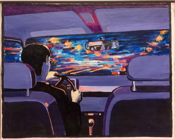 Рядом с вышеупомянутой картиной Дорога, хочется сравнить ещё одну работу Цоя, не являющуюся автопортретом. Лично меня чем-то цепляет сам факт существования двух одинаковых по сюжету и композиции картин, но отличающихся персонажем.