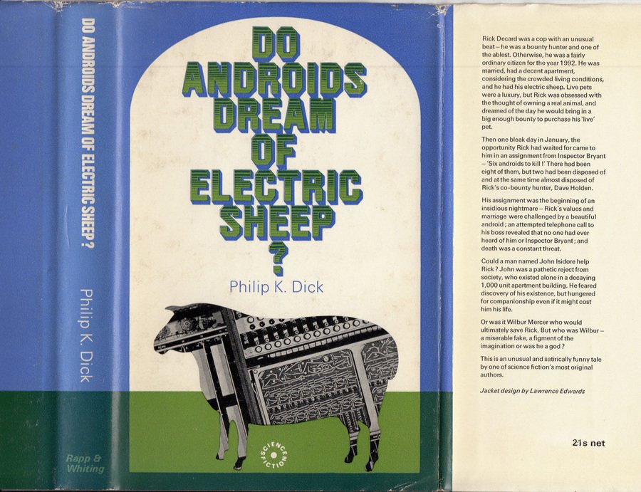 Первый британский тираж романа Филипа К. Дика «Мечтают ли андроиды об электроовцах?» был опубликован издательством Rapp & Whiting в 1969 году. На обложке работы Лоуренса Эдварда изображен силуэт овцы, заполненный фотографией электрических схем. Для названия использован двухцветный набор шрифтом Jim Crow, выровненный по центру, по одному слову в строке. На корешке суперобложки название набрано прописным Folio Condensed. Имена автора и издателя набраны двумя начертаниями из семейства Univers. Обложка романа задала примеры для дизайна последующих изданий с использованием образа овцы на грани технологичного и природно-животного. Гибрид биологического и технологического образов стал каноном для последующих изданий, визуализируя главную антиномию романа — противоречие между естественным и искусственным.