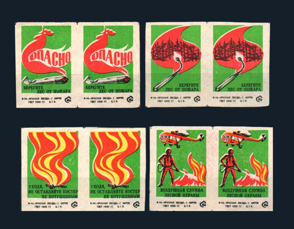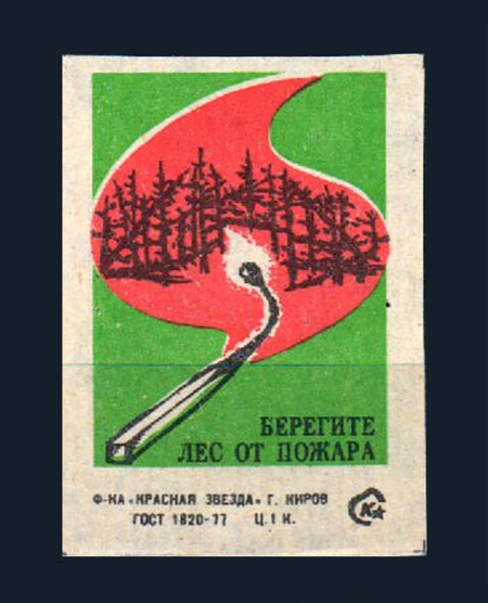 В серии «Берегите лес от пожара» цветовой язык предельно лаконичен: красный и зелёный. Это почти плакатная схема с резким противопоставлением — зелёный как метафора живого леса и красный как символ огня и угрозы. Из-за ограниченной палитры изображение строится большими пятнами: ёлка и трава заполнены однотонным зелёным, огонь — плоским красным, а детали элементов очерчены контуром. Такая конструкция при минимуме средств создаёт максимальную выразительность: опасность передаётся не деталями, а цветовым ударом, что делает композицию мгновенно читаемой даже на маленькой поверхности коробка.