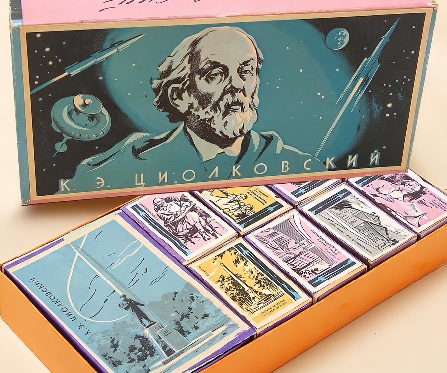 Серия «К. Э. Циолковский» использует другую стратегию: одноцветный фон, чаще голубой, сиреневый или охристый, образует основу, тогда как детали и персонажи печатаются чёрным. Это вариант двухкрасочной печати, где цвет выполняет роль атмосферного поля, а чёрная графика — информационного слоя. Монохромный фон создаёт настроение — ощущение глубины космоса или документальной строгости, — а чёрный контурный рисунок добавляет фактуру и смысл. Ограничение по цветам превращается в достоинство: строгая палитра усиливает научный и просветительский характер серии.