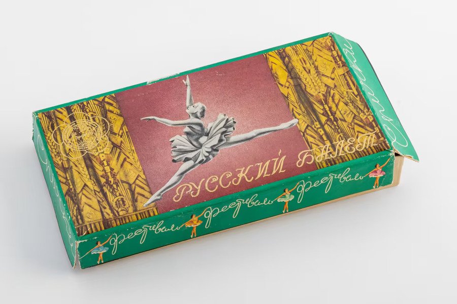 Совсем иной подход виден в наборах, связанных с праздниками, массовыми мероприятиями или искусством. В серии «Русский балет. К VI Всемирному фестивалю молодёжи и студентов» надписи становятся декоративными: имена персонажей вписаны в ленты, леттеринг создаёт ощущение сценического жеста, а заголовок задаёт торжественный ритм. Акцидентные шрифты здесь не информируют — они «играют», подчёркивая праздничность, движение, театральность. Такое использование типографики родственно афишам Большого театра того времени: буква не просто читается, она выступает в роли пластического элемента.