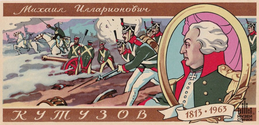 Немного иной принцип можно увидеть в серии «1813–1963. Кутузов». Здесь портреты строятся на сочетании крупных плоскостей и точно выверенного набора деталей. Изображения лишены фотографической точности и строятся всё так же на крупных цветовых пятнах. Однако детали формы, волос и черт лица позволяют сохранить портретное сходство и считываемость образов, делая при этом дизайн чистым и выразительным в рамках малого формата. Композиция организована строго и равномерно: все образы размещены в едином положении, выдержаны в схожем масштабе и ритме. Такая «архитектурная» упорядоченность превращает индивидуальные портреты в единую историческую линию, где важен не психологизм, а само присутствие. Именно эта статичная ясность позволяет зрителю легко считывать тему серии и моментально узнавать персонажей, не перегружая маленькую площадь коробка лишними графическими элементами.