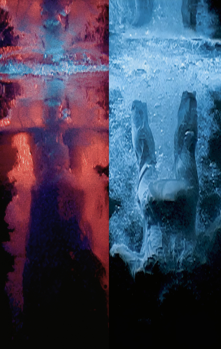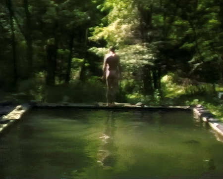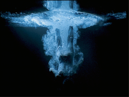 Здесь вода функционирует практически как единственный подвижный слой изображения. Пространство вокруг остается статичным, и все изменения происходят только в отражении на поверхности бассейна. Например мужчина, зависший в прыжке над водой, находится в состоянии полной неподвижности, в то время как отражение продолжает жить по своим законам. Такой прием подчеркивает разрыв между физическим временем и визуальным временем изображения. Виола трактует это как этап «вхождения человека в природный мир» — переход, который по структуре напоминает ритуальное омовение.