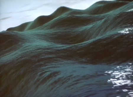По мере развития работы океан становится более агрессивным: волны растут и изображение начинает дезориентировать. Вода, которая в начале кажется успокаивающей, превращается в тревожный знак. Она размывает привычные ориентиры, делает невозможным удержание равновесия — и физического, и психологического. Эта трансформация ключевая. Пиччинини показывает, что даже идеально «естественный» цифровой образ природы может ввести тело в состояние тревоги и дезориентации. Вода здесь выступает двойственным знаком: сначала — успокаивающая стихия, традиционный символ непрерывности и масштаба, затем — разрушительная сила, размывающая привычные ориентиры. По мере того, как виртуальный океан становится всё более хаотичным, зритель ощущает собственную уязвимость перед тем, что кажется природным, но на самом деле создаётся цифровым кодом.