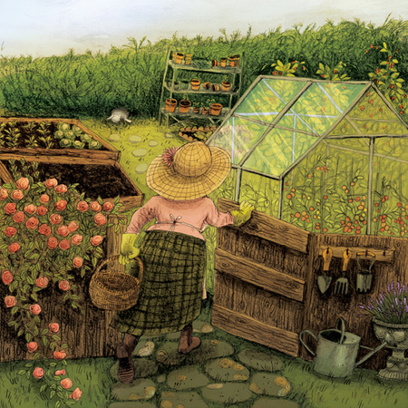 Интересно, что каждый раз Брайони как бы задаёт основной цветовой тон, вкрапляя и органично вкрапляя туда яркие детали. К примеру, на общем зеленоватом фоне органично встраиваются розоватая блузка с жёлтыми перчатками героини и цветы, присутствующие в саду. Такие аккуратные детали усиливают очарование и делают иллюстрацию настолько живой, что кажется, ещё мгновение — и можно будет почувствовать тепличный аромат.
