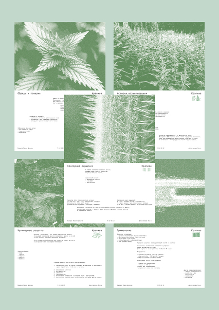 При создании плакатов я хотела передать ощущение шероховатости и «жжения» от растения. Все фотографии я объединила общим цветом и добавила эффект шума, чтобы передать тактильные ощущения. Текст расположен хаотично, и это не случайность. Я пыталась передать эту неожиданность от укуса крапивы, как никогда не ожидаешь, в какой момент можно обжечься об неё, так и не ожидаешь, где будет расположен текст на следующем плакате.