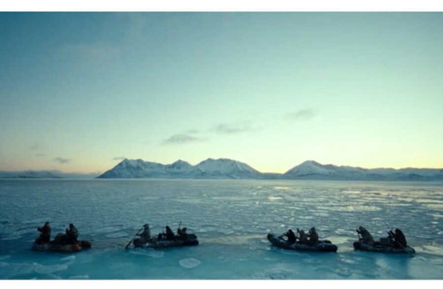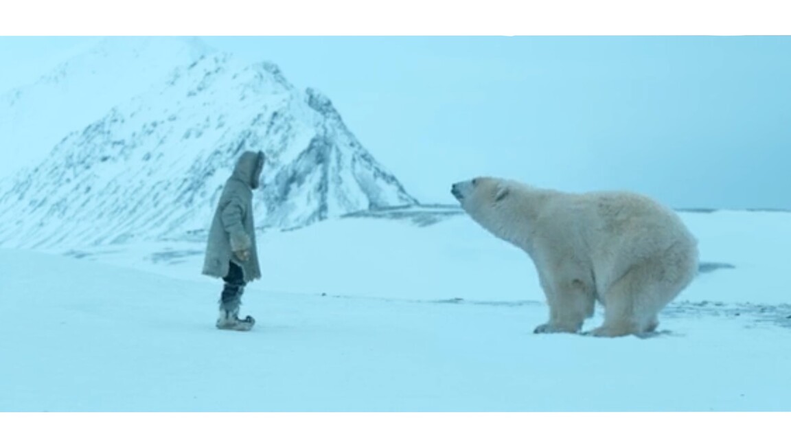 Вторым примером станет фильм «Выжить в Арктике» 2014. Тут мы видим совершенно другой Север: бури, снег, ледяной океан, опасности, дикие животные. Север абсолютно нелюдим, он как стихия, как испытание. Мы сново встречаем образ семьи, дети в поисках отца «мотив поиска». Так Север становится пространством небезопасным, но значимым. Кинематографические приемы, демонстрируют силу и доминацию природы на человеком, складывается ощущение ничтожно малой принадлежности к месту.