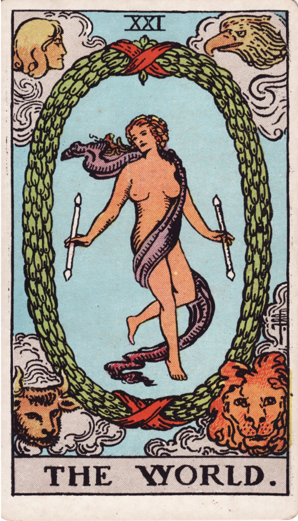 Шут в классическом Таро— это знаменование нового начала или же души, пришедшей в человеческий мир. На картах Райдера-Уэйта он изображен в активном шаге, его тело развернуто по диагонали. Горный пейзаж и обрыв придают сцене драматизма и повествовательности. Композиция многослойна и создает ритм, ощущение движения. Также, как и у Блейка, создается диагональ— взгляд Шута, направленный в небо, создает это ощущение. Основные цвета тоже: желтый, красный и голубой. Теперь они имеют не только практическое, но и символическое значение: желтый—чувство радостного предвкушения, белый- символы чистоты души и невинности. Обрыв, как и в изображении Антея, символ границы миров, находится справа. Уэйт и Смит добавляют к версии Таро Висконти символические детали: собаку, цветок, солнце. Далее в их иллюстрациях будет важно все изображаемое, что очень близко к поэзии и живописи Блейка.