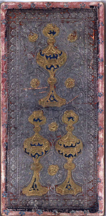 Эти карты изготавливались из прессованного картона, на который наносился тонкий слой специального грунта из мела и гипса (левкаса), разведенного на животном клее. Затем его покрывали листами сусального золота или серебра, создавая запоминающийся фон. Рисунок наносился поверх красками. Изображение получалось долговечным и ярким, блистающим роскошью, что и ожидали заказчики.