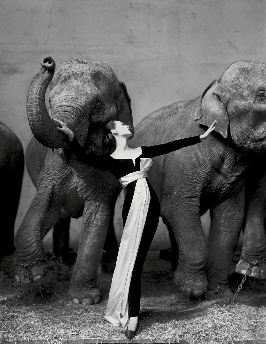С популяризацией фотографии как главного медиа в моде использование животных участилось. Одна из самых иизвестных и значимых съёмок — «Dovima со слонами» Ричарда Аведона. Он смог ловко и концептуально поместить элегантный кутюрный наряд на нестандартный фон слонов из цирка. С помощью такого необычного бэкграунда он добился напряжённого контраста дикой природы и изысканной модной женщины.