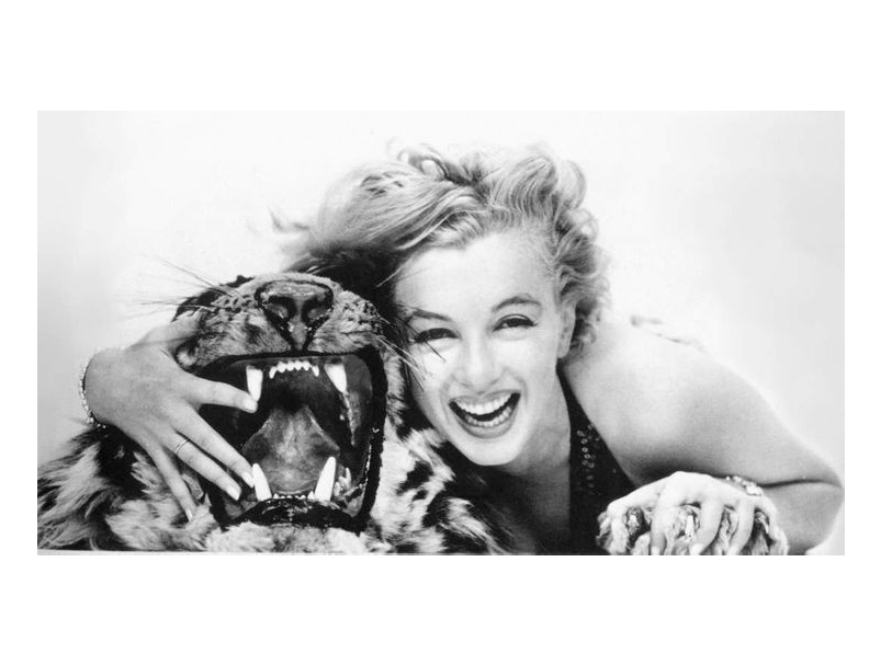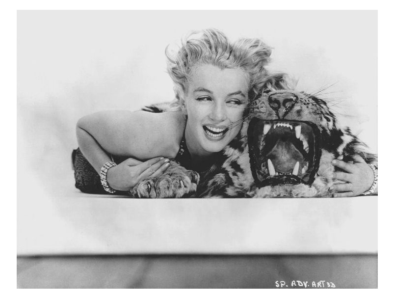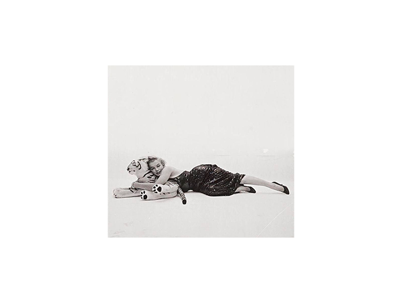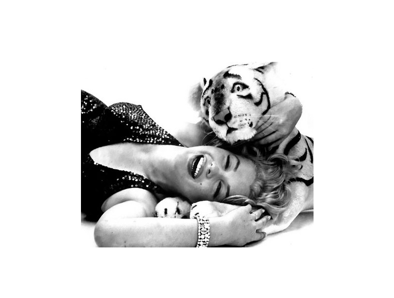Необычная фотосессия легендарной актрисы с игрушечным тигром. Мне кажется, то что такой опасный хищник изображен плюшевым и мягким рядом с такой роковой женщиной создаёт сильный визуальный парадокс. Здесь опасность превращается в декоративность, хищник — в аксессуар, а напряжение — в игру.